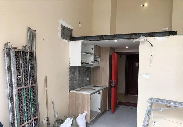 但是廚房衛(wèi)生間地面是最容易出現(xiàn)水漬的地方,木地板明顯不合適,所以拆掉。為了讓整個空間更加通透,移門也拆掉了,還有通往二層的樓梯也全部拆除了。