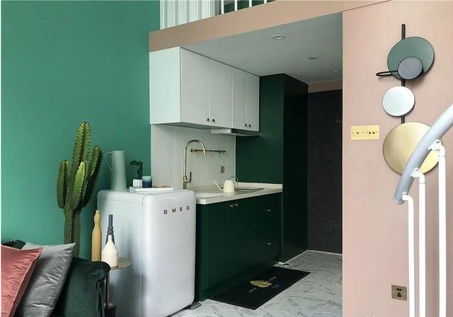 至此,整個充滿少女心的單身公寓已經(jīng)介紹完畢了。設(shè)計師巧用當(dāng)下流行的魚骨拼地板、人字拼瓷磚、黃銅裝飾等元素,將他們與翡翠綠的房間組合在一起,讓整個家在滿足居住使用的基礎(chǔ)上,變得更加少女心。