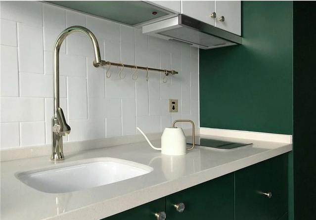 廚房后擋板選擇了容易清理的陶瓷瓷磚,改變瓷磚鋪貼方式,讓背景板更具層次性。