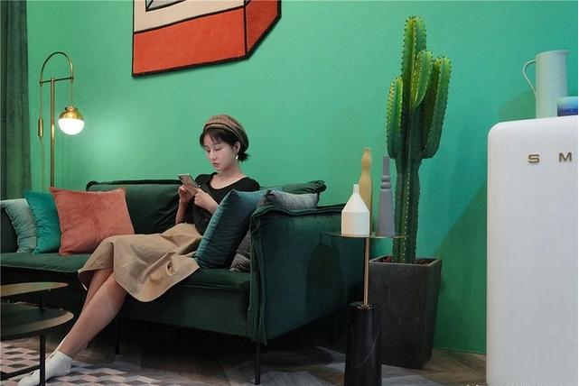櫥柜旁邊則是高顏值的SMEG冰箱,旁邊搭配1.5米高的仙人掌,剛好作為客廳的隔斷。