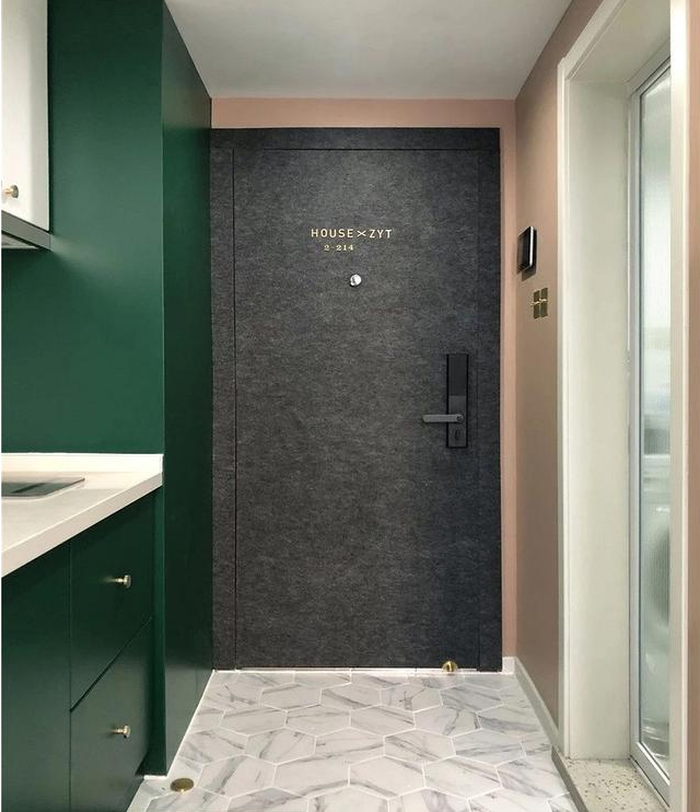 想要增加防盜門的防盜等級,其實只需換掉門鎖即可,黑色磨砂把手更具質(zhì)感。其次用毛氈遮蓋住原本防盜門的豬肝色。毛氈自帶背膠,自己一個人也可以完成防盜門的改造。