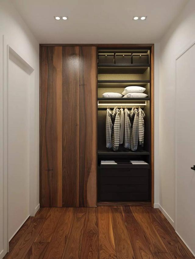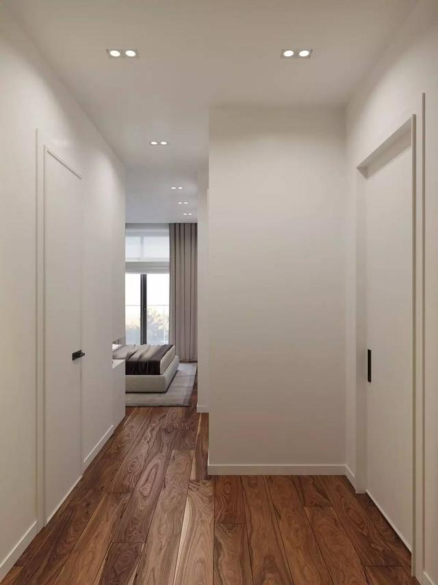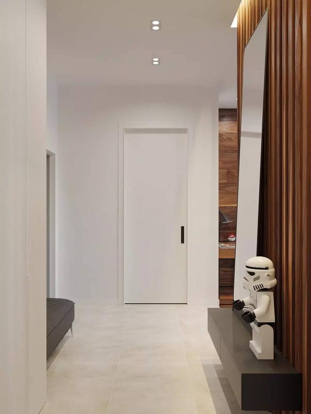 玄關,正對一道隱藏門。入戶風景沒有很復雜,先來個科幻元素點綴一下懸空的端景矮柜。