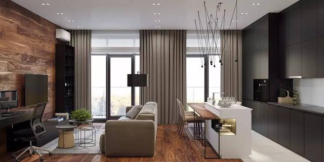 廚房島臺接餐桌椅,功能區略有重疊,利用率高?,F代感極強的吊燈,線條設計,某些角度接近隱形,頗有藝術感。