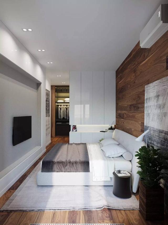 臥室木質背景墻與文藝掛畫,襯得房間簡約中帶點不平凡。