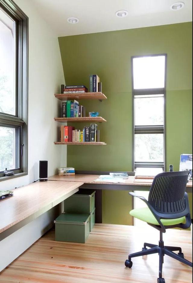 利用轉角安裝L字型書桌,再在墻面上安裝上書架,擺放書籍,一個簡單而別致的轉角書房則打造完畢,頓時為居室增添一個實用的功能區。