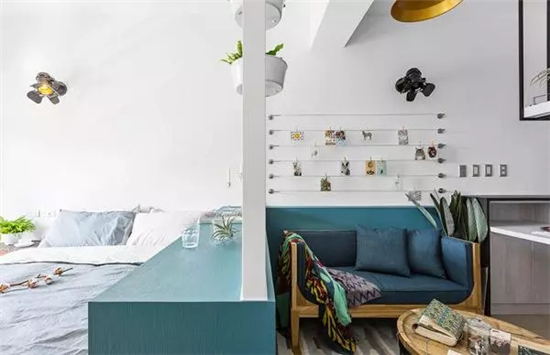 將這個小空間改造成了開放式設計,為了明確區分不同功能區間,設計師在顏色的選擇上下足了功能,把白色的的空間作為重點區域,亮眼的藍綠色的柜體和沙發讓客廳生動起來。