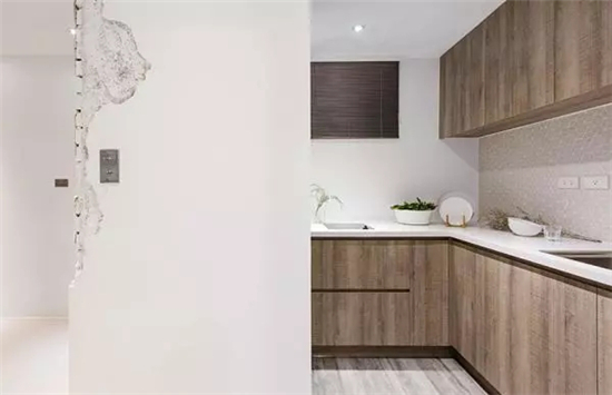 為了讓開放式的廚房裝修在狹小的空間中具有獨立感,在沒有變動位置的狀況下,設計電器柜延長廚房外牆,更明確的劃分出了廚房區域。在墻面設計上,刻意保留了局部破壞的磚痕跡,營造出一種粗糙的美感。