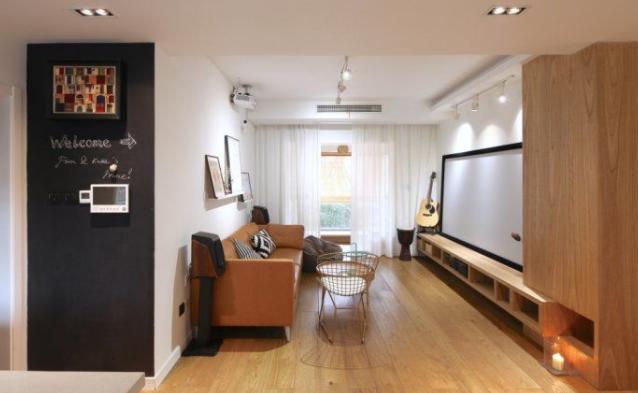 參考到面積太小的緣故,為了不讓客廳的布局顯得那么局促,于是采用了很小的圓桌茶幾,電視柜簡單造型,面寬三米三的客廳最終選擇了安裝投影儀,100寸的灰玻纖投影幕布,配合1080p短焦投影,配合電視墻的氣氛燈帶,聚會游戲音樂都絕對氣氛十足!