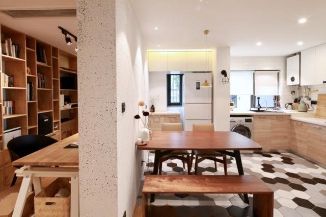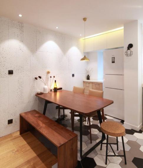 餐桌就位于廚房左側,因此端菜這些都非常方便,還承載了設計師對于不同時期的各種用餐需求,不論是一個人工作時的一杯咖啡,還是二人世界的你儂我儂,或是朋友小聚的胡吃海喝,多口之家的年夜飯,都能稍作調整輕松應付。