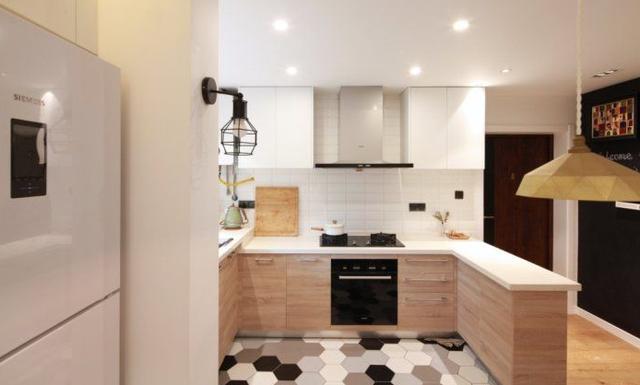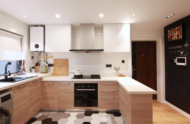 入戶門口就是廚房,L型櫥柜能夠適應多人下廚的可能性,在吊頂處安裝了多組射燈,晚上做飯光線也非常充足。靠門邊做了吧臺,吧臺內腔則是用作鞋柜,超大容納量。