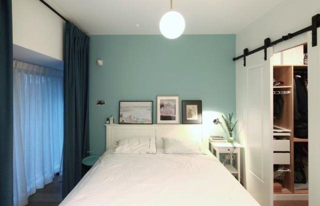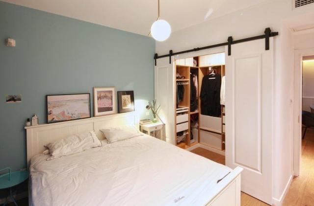 主臥是非常清新的黛藍色墻面,不喜歡浪費一寸空間的設計師做出了一個很小衣帽間,床是訂做的橡木箱體床,結合衣帽間可將被褥床品及冬季衣物輕松收納。另外為了充電方便床兩邊都設了usb接孔面板。