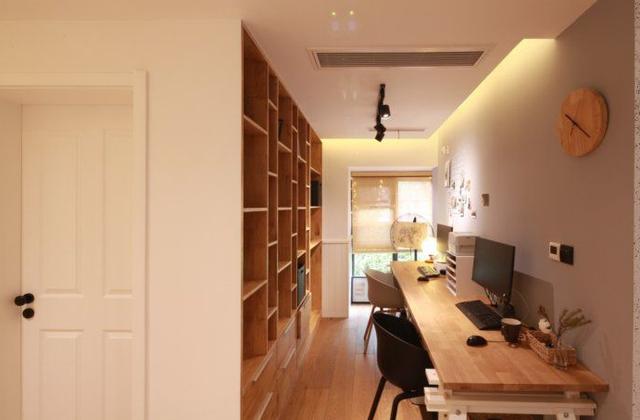 餐廳左側的書房區域,狹長的書房做了很大的書架,可以裝下一卡車的書籍了,溫和的壁燈光線很適合工作、看書、打游戲。