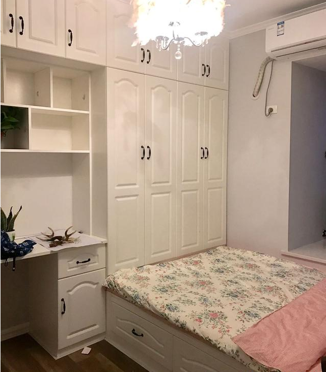 這間是我的臥室,考慮到儲物空間不太夠就做了榻榻米,和衣柜還有書桌柜一體化設(shè)計,給室內(nèi)增加了不少收納空間。