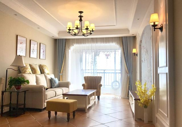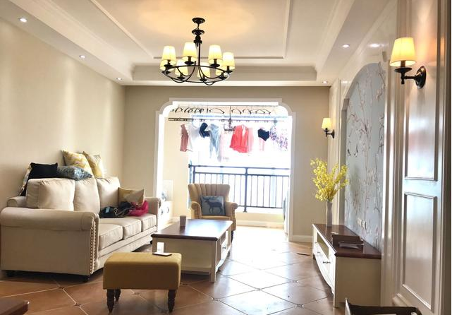 除了主沙發(fā)之外客廳還放了一張單人沙發(fā)和方凳,和茶幾呈圍合狀擺放。電視墻讓木工用石膏板做了造型,中間還貼了墻紙,看起來非常小清新。陽臺因為要晾曬衣物,所以安了窗簾做隔斷。