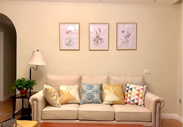 沙發(fā)選擇米色的一字型沙發(fā),搭配幾個色彩豐富的抱枕,沙發(fā)上方還掛了三幅我自己畫的畫,買了框裱起來還挺好看的。