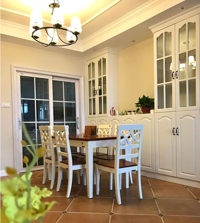 玄關(guān)背面是廚房,緊鄰著的是餐廳,用玻璃門做了隔斷。餐廳選擇方形的餐桌椅,相較圓桌更加節(jié)約空間。旁邊還做了正面的餐邊柜,中間部分只做了矮柜,柜子上方可以放裝飾品,墻上還有一個鹿頭造型。