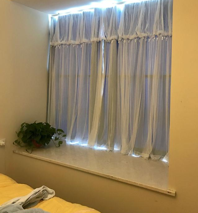 室內(nèi)有個小飄窗,因為承重墻沒法拆,就這么放著了。窗簾是網(wǎng)上購買的,紗簾和純色兩層,看起來很飄逸。