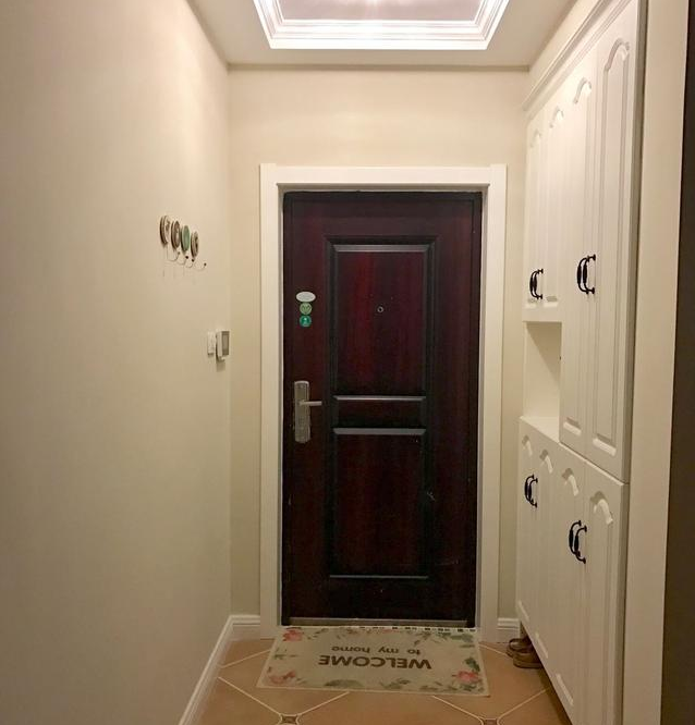 進(jìn)門一個小小的玄關(guān),左手邊是定制的嵌入式鞋柜,右手邊安了幾個掛鉤可以掛衣服和包包等。