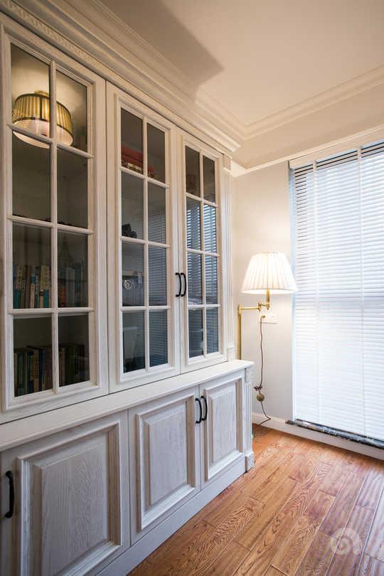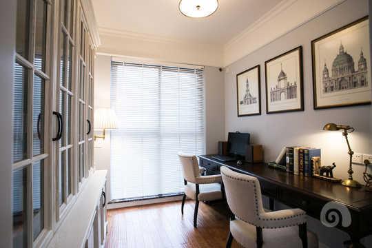 美式風格中的簡約書房裝修,采用白色書柜,有點韓式風格的味道,配上深色的書桌,還有百葉窗的設計,使整個空間貴氣十足。