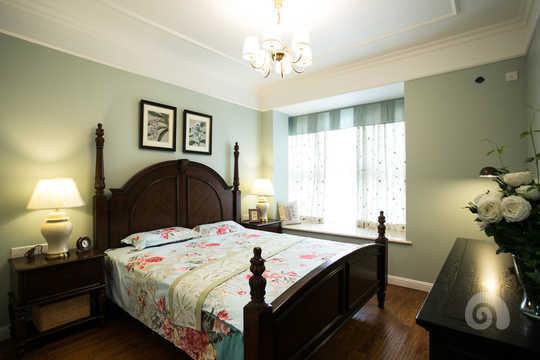 主臥的整體造型設計都非常的簡潔,美式實木床和深色的地板相結合,給人非常溫馨的感覺。深色與淺色的對比,彰顯出現代美式的一種層次感,簡潔明晰。