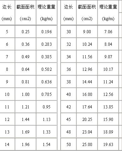 (1)在標準件中,邊長105-250毫米的方鋼未列出截面面積及重量,必要時可參照表列數據的倍數進行算。 (2)方鋼的長度規定如下: