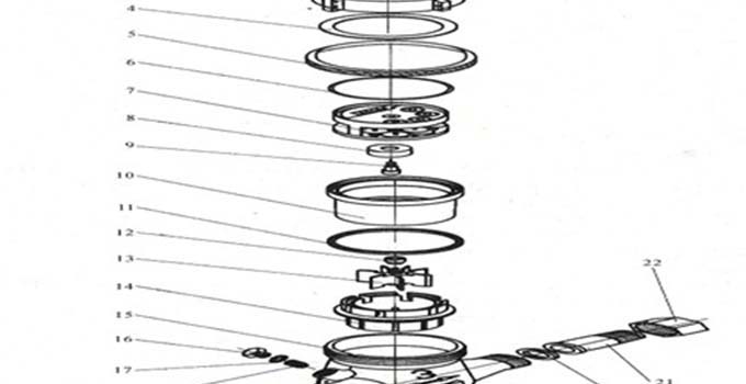 1-表蓋;2-軸銷;3-銅罩;4-罩子襯墊;5-表玻璃;6-O形密封圈;7-計數器;8-防磁環;9-中心齒輪,10-齒輪盒;11-墊圈;12-磁鋼座;13-葉輪;14-葉輪盒;15-表殼;16-調節螺釘;17-調節螺釘墊片;18-調節塞;19-濾水網;20-接管墊片;21-接管;22-連接螺母。