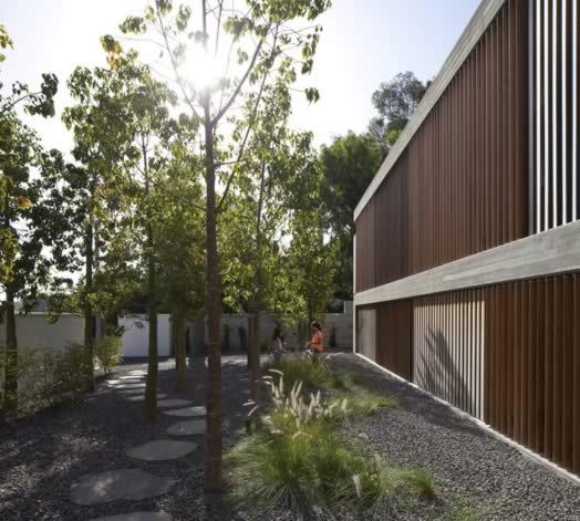建筑師 Pitsou Kedem 為自己家設(shè)計(jì)的住宅所在街區(qū)是 1950 年由隊(duì)伍軍人所建,在茂密的桉樹林里,其低矮的輪廓和水平線條顯得格外突出。