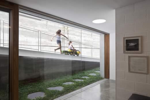 住宅結(jié)合了例如混凝土樓板和連排的窗戶等元素,也采用了最原始的材質(zhì)狀態(tài): 外露的混凝土、 鐵、沒上色的木材和硅酸鹽磚。這些使用的例子從入口天花就能看出,一個(gè)連續(xù)的窗貫穿整個(gè)長度。這使得天花從結(jié)構(gòu)墻區(qū)分開,在整個(gè)建筑體和通向懸浮入口大堂那漆成白色的鐵質(zhì)坡道中創(chuàng)建一種微妙的感覺。