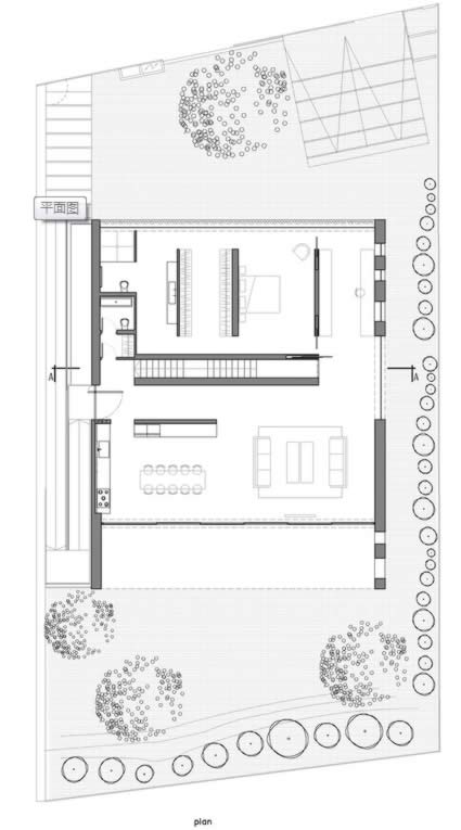 門在建筑的中間穿過樓梯之間的部分,面向一個(gè)固定的無框窗口。透過窗戶,我們看到環(huán)繞整個(gè)布局的桉樹。樓梯由特殊紋理的金屬材料制成,未覆蓋任何面層材料。它把上下兩層分為兩個(gè)矩形,分別由支撐屋頂?shù)穆懵督Y(jié)構(gòu)組成的兩面墻界定。由木條封印的天花透下光照亮整個(gè)室內(nèi)。墻內(nèi)嵌入不同尺寸的圓形窗戶,允許光線透過天窗分散進(jìn)來。