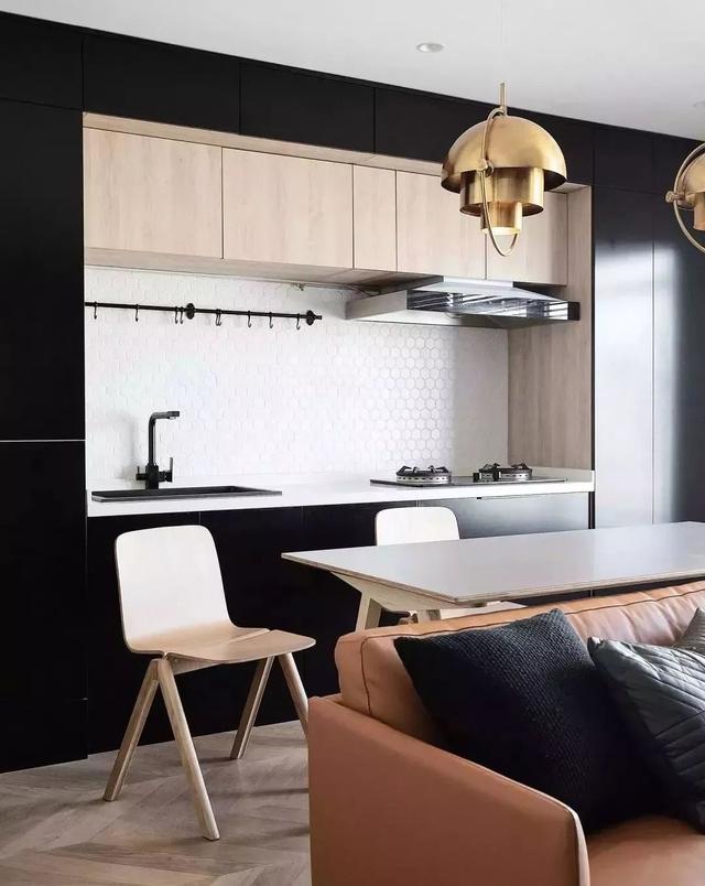 黑色的櫥柜既像廚房既能儲物又像是沙發的背景墻