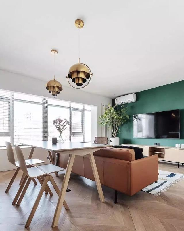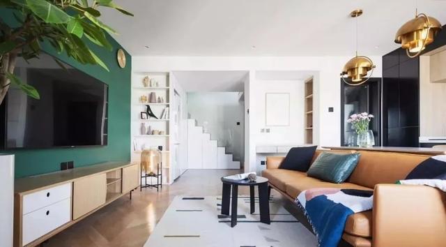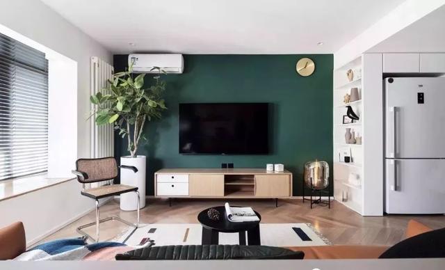 客廳的電視背景墻大膽的采用了整面墨綠色的設計