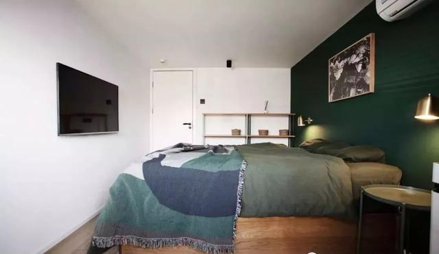 主臥中整面墨綠的背景墻配上兩盞金屬小燈