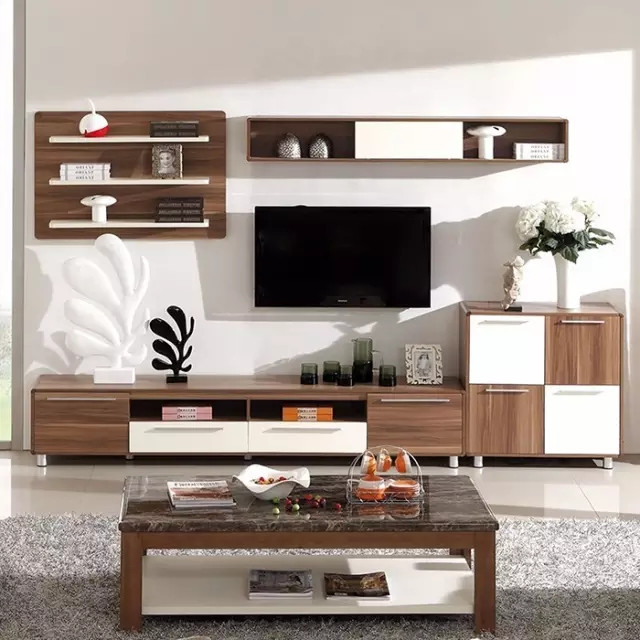 在客廳安裝組合式電視柜,不僅能陳列一些裝飾擺件,還具有一定的收納功能,更能增加客廳的層次感。