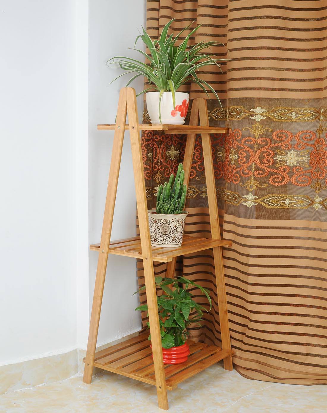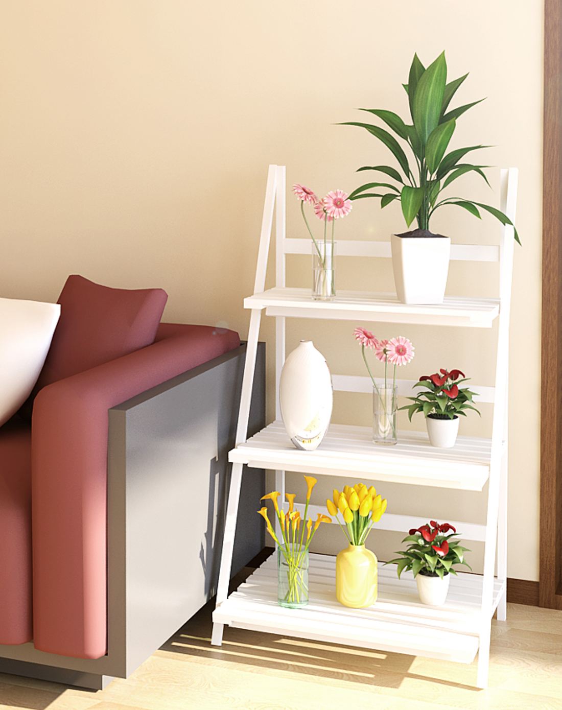 簡約時(shí)尚的外形,經(jīng)典的白色,全實(shí)木獨(dú)立層架,可放置室內(nèi)花卉和裝飾品等,三層實(shí)木花架尺寸如上圖所示:高88cm、長50cm,第一層寬35cm、二層27cm、三層19cm。并且支架可以根據(jù)需要,進(jìn)行細(xì)微的調(diào)節(jié),更合理的利用空間,花架背檔條的設(shè)計(jì),避免花卉等裝飾品不慎滑落,同時(shí),讓產(chǎn)品更加穩(wěn)定。
