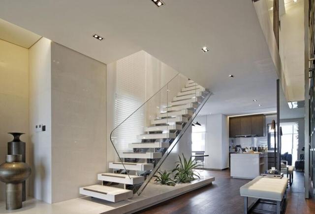 玻璃扶手更適合現代的年輕人。透明的質感,會讓樓梯顯得簡約大氣又不失時尚味道。視覺上還能增大開闊感,所以很多辦公區和商場都能看到這種扶手。不過選材一定要注意選擇防爆、防裂玻璃。