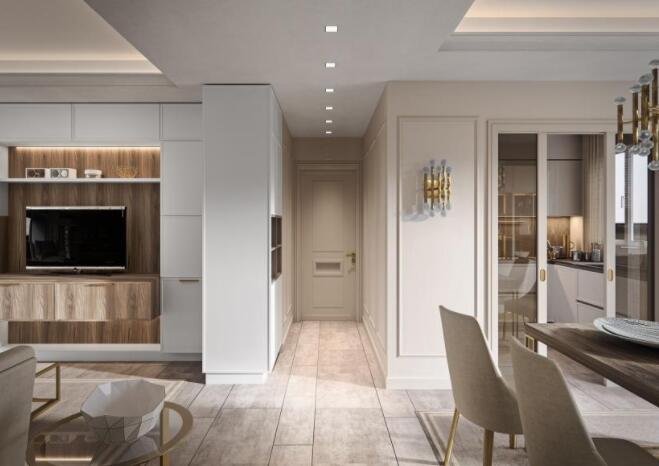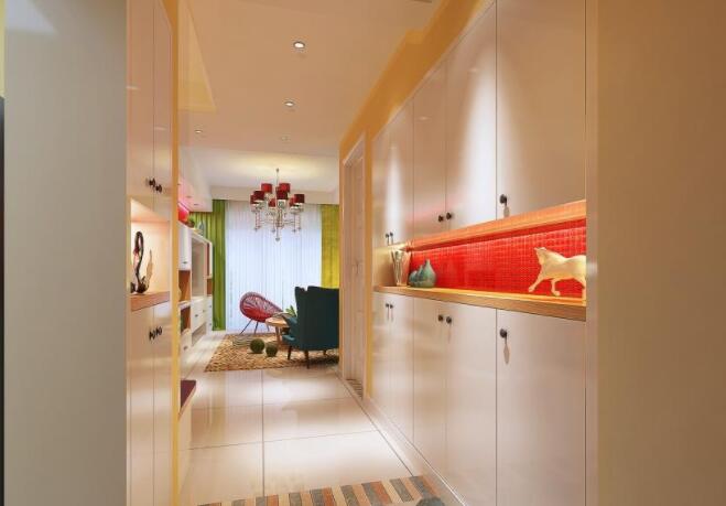 進門走廊兩邊定制儲物柜,增加了不少收納空間;白色柜體與白色吊頂相一致,使得整個家居更加純凈明亮。簡潔的走廊吊頂設計,與客餐廳吊頂相連,講究和諧統一,小巧的筒燈嵌入吊頂內,照明之余還具有裝飾性。