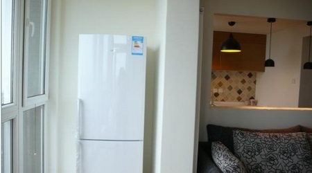 客廳陽臺 ,還有開放式廚房。電冰箱被放到客廳陽臺上了,因為客廳在北面,太陽也曬不到 。正好有個可以放冰箱的位置。 有的人家有把放冰箱的這個地方改造成儲物間的,全是格子,拉上個漂亮點的簾子也很好。