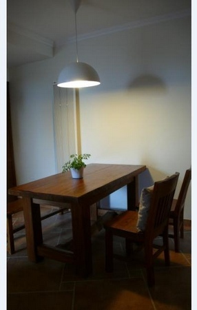 餐廳整體效果 ,還沒有最后裝飾的效果。桌子是老榆木的桌子和椅子一共是3600元。餐桌燈購于宜家 ,幾百塊錢。