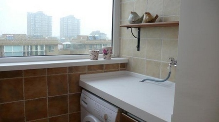 對面的空間 ,洗衣機被放在了這里。 其實這個位置本來就是留給洗衣機的,因為有下水 。目前看挺方便。這里還做了隔板,可以放一些小東西。隔板在宜家可以買,算上支架,大概100多。 洗衣機的管子接的有問題,有點繞遠了。這個是個遺憾 。現在微波爐也放在洗衣機上的臺面上了 。