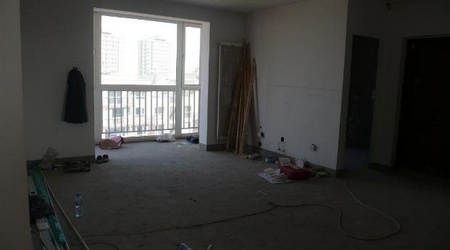 毛坯時期客廳的照片。可以看到客廳上的陽臺,入戶門右手的門口內是廚房 ,客廳和廚房之間有一座非承重墻。其實這座墻是可以通開的,也就是可以做開放式廚房。