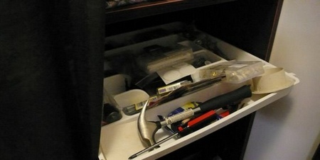 儲物間(也就是原來的衛生間)。做了一個百葉推拉門 ,此門做下來大概是300塊錢不到。推拉門里面找人做了個整體衣帽間。平時掛一些隨身衣物,還有不蓋的棉被。另外放一些工具什么的 。非常實用,我家雜物就指望它了。