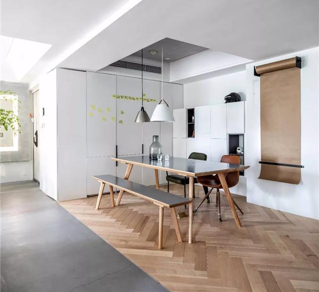 不拘泥于狹小空間的餐廳,整個餐廳設計,主要以大白墻與同色系的壁柜為背景,營造出一種干凈明亮的感覺。通透的空間給人的視覺上呈現出一派簡約清新,順帶可以將一些家電隱藏在柜體中。