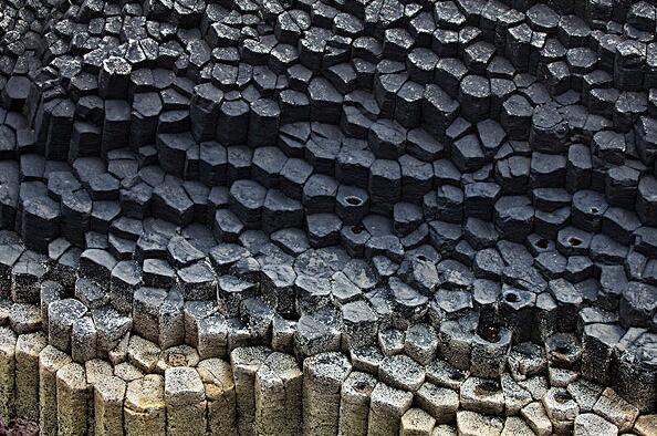 玄武巖構(gòu)造與其固結(jié)環(huán)境有關(guān)。陸上形成的玄武巖,常呈繩狀構(gòu)造、塊狀構(gòu)造和柱狀節(jié)理;水下形成的玄武巖,常具枕狀構(gòu)造。而氣孔構(gòu)造、杏仁構(gòu)造可能出現(xiàn)在各種玄武巖中。