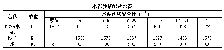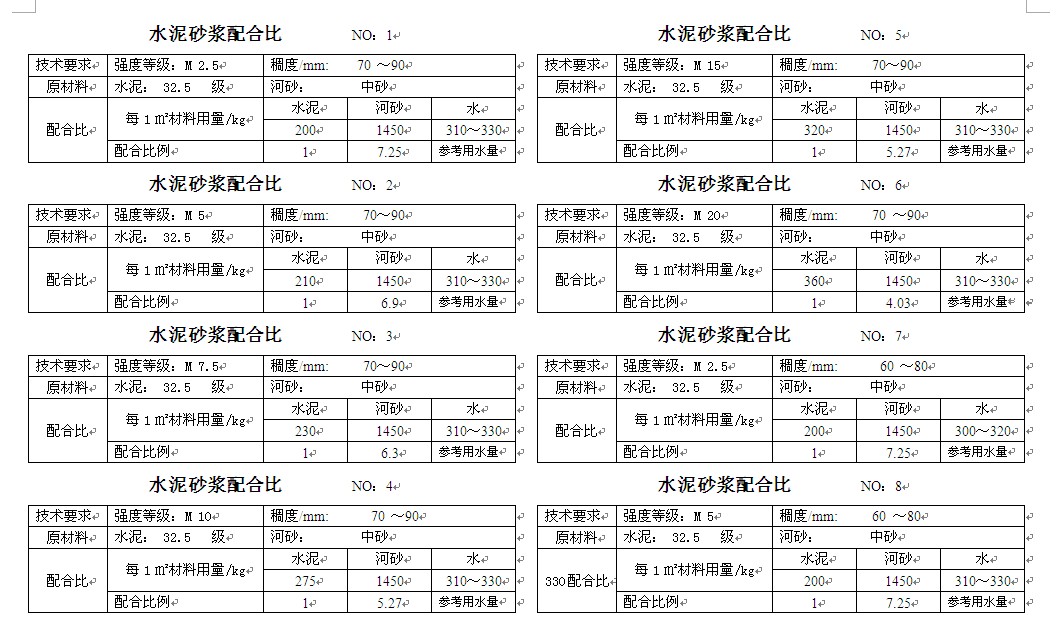 100號(hào)水泥砂漿就是說(shuō)它的強(qiáng)度是100kg/cm2,但是現(xiàn)在全部改成以MPa為單位了,100號(hào)對(duì)應(yīng)于M10。配合比根據(jù)原材料不同、砂漿用途不同而不同,沒(méi)有一定的,以常用的42.5普通硅酸鹽水泥、中砂配100(M10)砌筑砂漿為例:水泥305kg:砂1.10m3:水183kg。