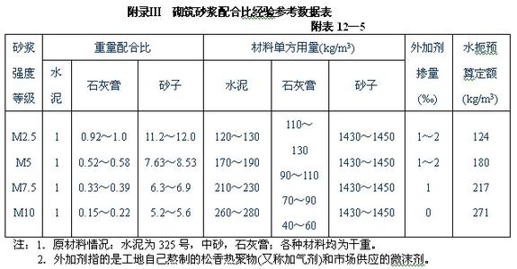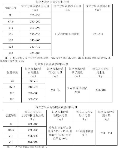 每立方M7.5 混合砂漿P.S32.5 水泥用量0.277T 細(xì)砂1.23m3 石灰膏76kg 水0.34m3 每立方M5.0 混合砂漿P.S32.5水泥用量0.245T細(xì)砂1.23m3石灰膏107kg水0.32m32、