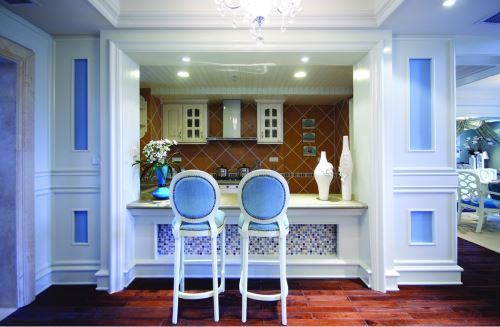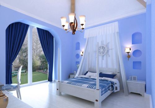 風格的確定也會影響到裝修的預算,如果只有五萬元,那就要放棄古典歐式或者古典中式等的裝修了。但是現在的流行風格,如新中式,地中海風格以及簡約田園風格等,都是非常有效果但是又花費較少的裝修方式。像圖中的就是地中海風格的臥室,四周的墻壁都是粉粉的藍色,這種色調比較的柔和,帶有一點濕潤的感覺。只要使用水性涂料就可以達到效果,并且在墻壁上摳出幾個格子,單純的幾何形狀就可以起到裝飾作用,并且省去了收納柜的資金預算。天花板甚至都可以不用吊頂的,因為這中地中海粉葛根要的就是清涼的感覺。所以,房頂只要用白色水性涂料粉刷即可,在周圍走一圈石膏線,依然很美觀。
