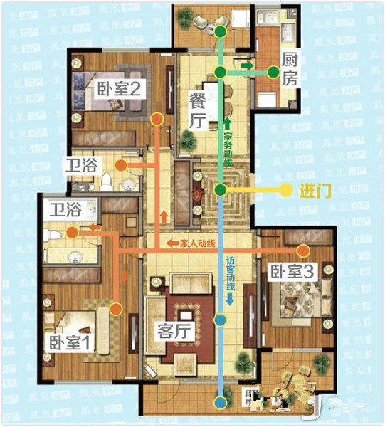 戶型動(dòng)線分為家人動(dòng)線、家務(wù)動(dòng)線、訪客動(dòng)線。三條動(dòng)線劃分了不同區(qū)域,分割了各自的空間,且三條線不能交叉,不然會(huì)導(dǎo)致戶型空間功能混亂、動(dòng)靜不分、造成房屋面積的浪費(fèi)。