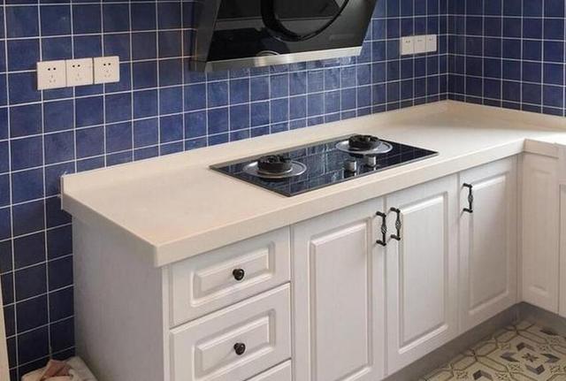 廚房里設(shè)置了L型櫥柜,將轉(zhuǎn)角空間充分的利用起來。地面上鋪設(shè)了仿古花紋瓷磚,搭配深藍(lán)色墻磚,豐富了整個空間里的層次感。上方安裝了整整一排的吊柜,充分的滿足了各種餐具以及廚具的收納問題。