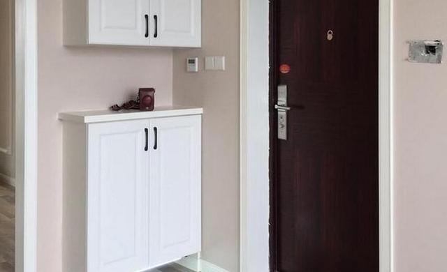 進門的玄關(guān)處設(shè)置了一個玄關(guān)鞋柜以及吊柜,里面還安裝了隱藏?zé)魩В让烙^又實用。墻面涂刷成了肉粉色,搭配白色踢腳線以及深淺不一的木地板,非常和諧統(tǒng)一。