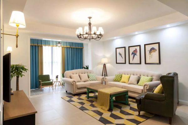 客廳里十分而畢竟錢掛上掛了三幅掛畫裝飾,搭配淺色的而不宜三幅,還有單人沙發,中間鋪了地毯,地毯上是茶幾,還有簡約大方的吊燈照明,整個客廳看起來都十分大方休閑。
